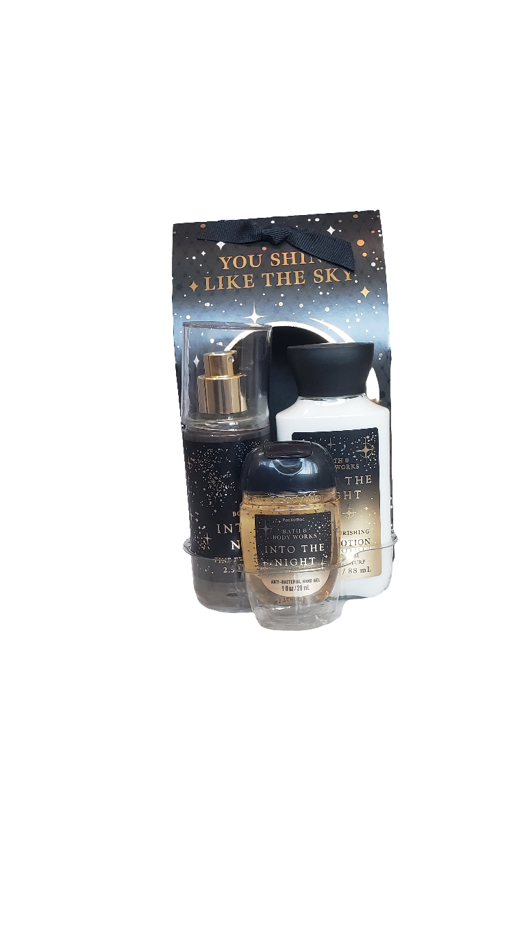 Incluye un aerosol de fragancia fina en tamaño de viaje (3 onzas líquidas), una loción corporal en tamaño de viaje (3 onzas líquidas) y un desinfectante de manos Pocketbac (1 onza líquida)